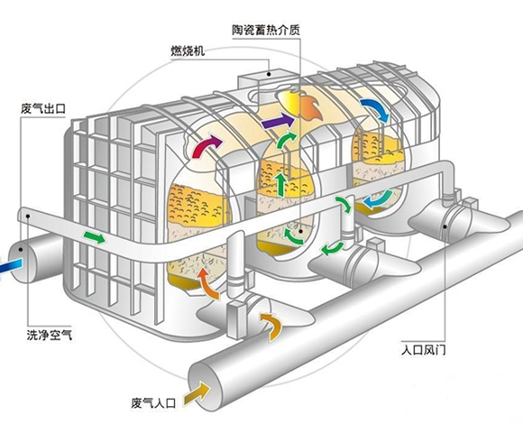 对VOC排放浓度和排放速率要求较高的情况下,可设计三个或五个蓄热床,每个蓄热床依次进行蓄热—放热—清扫的循环过程。