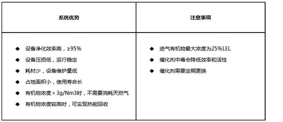 CO系统采用电加热升温,将小风量、高浓度的有机废气加热到300℃,在贵金属铂、钯、铑的作用下,有机物活化能降低,催化氧化分解成无害的CO2和H2O,同时放出大量热量,化学反应方程式如下: ![]() 经催化氧化后的高温烟气(≥400℃)通过板式换热器,与新进的有机废气对流换热,新进的废气被预热,烟气温度被降低后达标排放。
